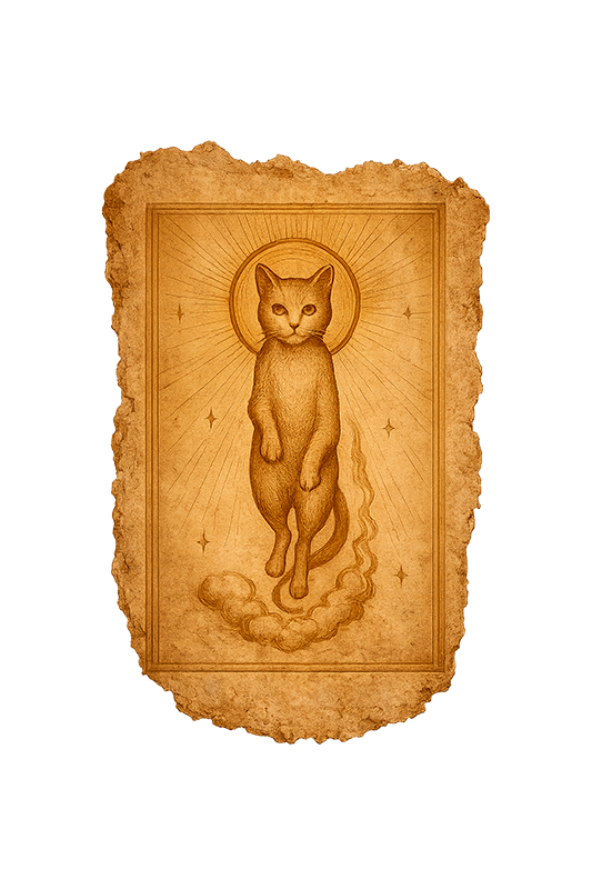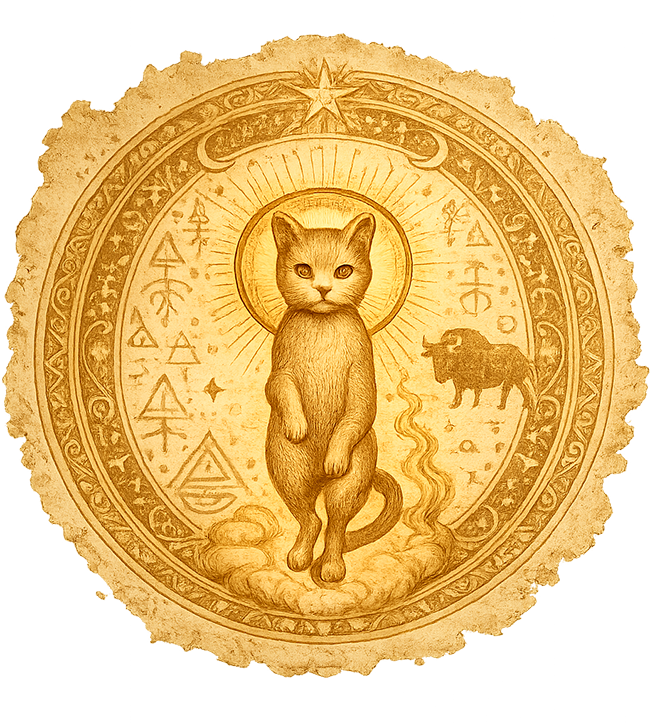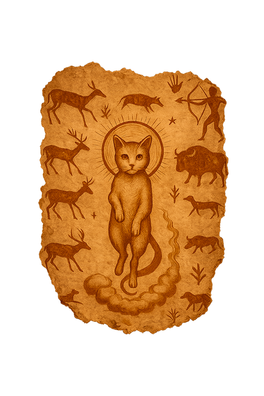 Un chat gravé parmi des signes inconnus. Aucune langue identifiée. La phrase reste incomplète.